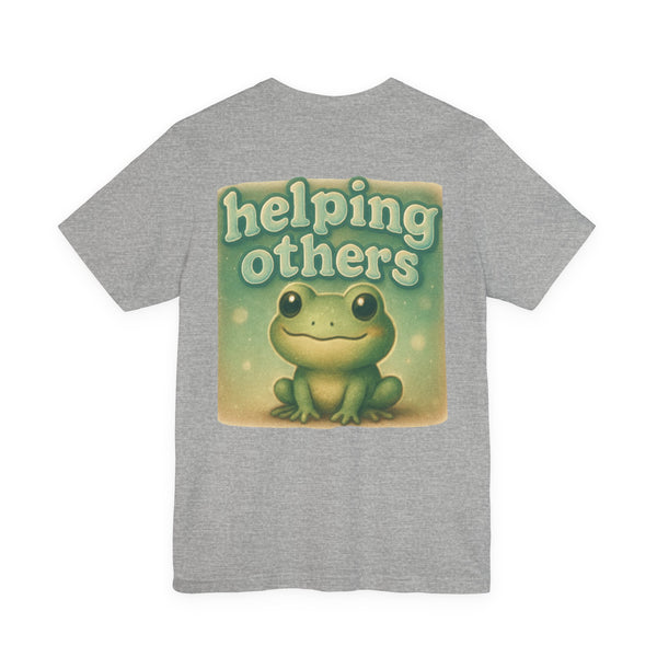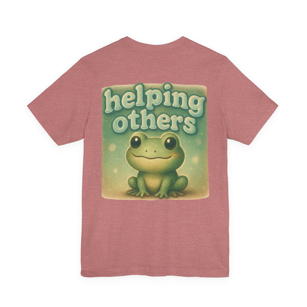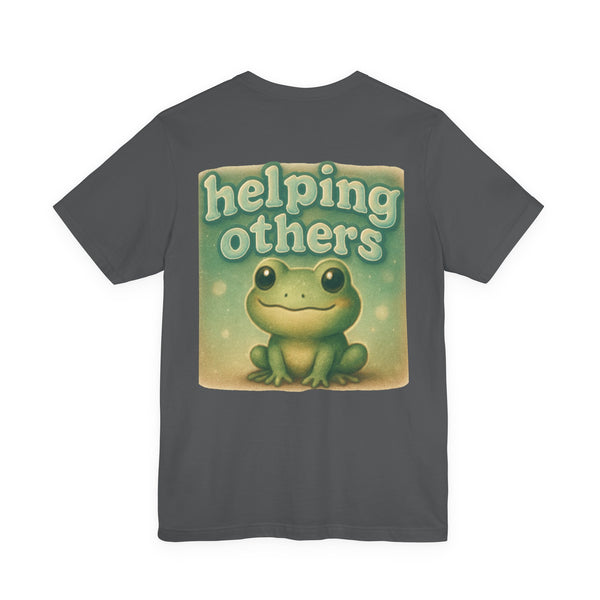 Soft, breathable tee with a warm, nostalgic print — a little frog sits beneath bubbly lettering that reads “helping others.” Lightweight and breathable, this shirt layers easily and moves with you during everyday tasks or long, relaxed afternoons. The gentle color palette and rounded type feel comforting and kind; wear it when you want to share a quiet message of care without saying a word. The back print makes a friendly statement while the clean front keeps the look versatile for errands, volunteer shifts, or cozy meetups with friends.