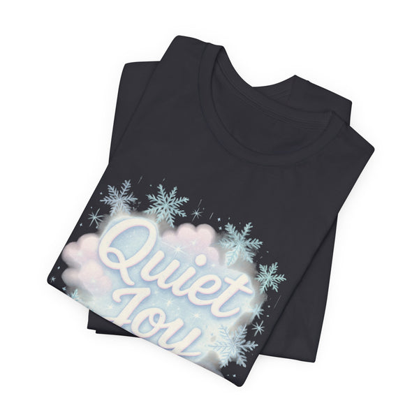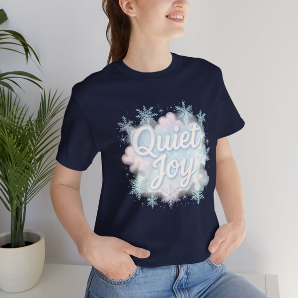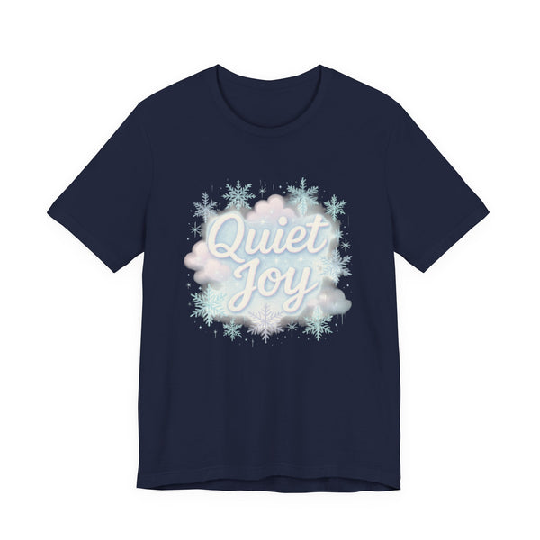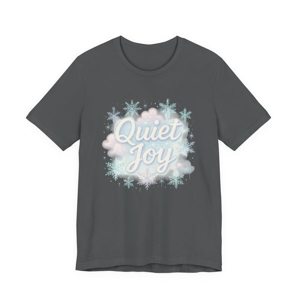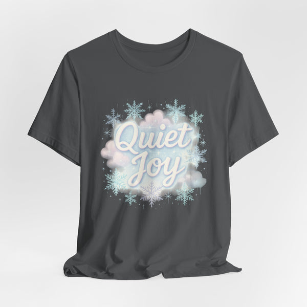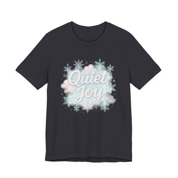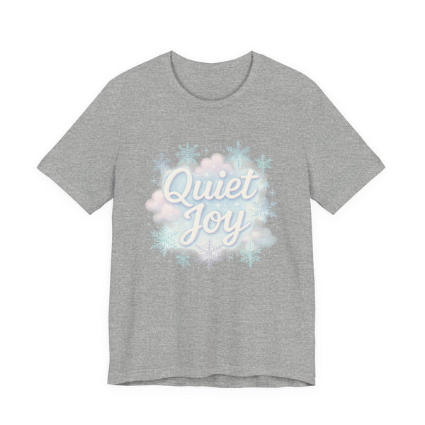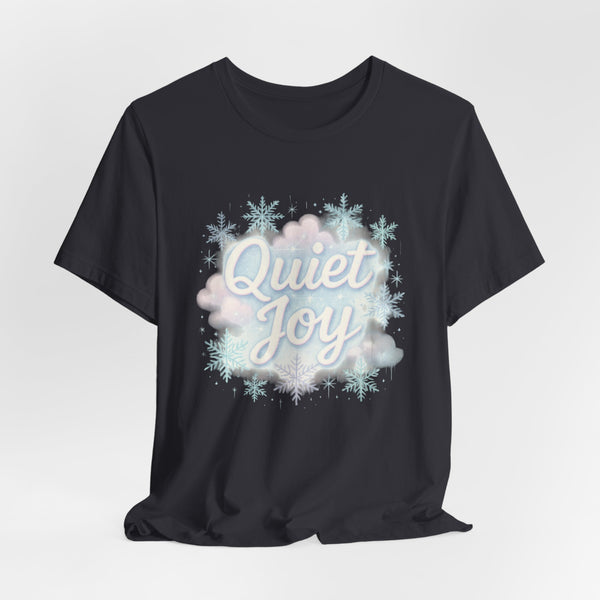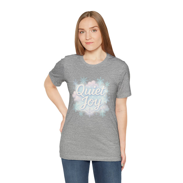Soft, calm, and quietly festive — this lightweight jersey tee carries a gentle winter mood. Pastel snowflakes and cloud-like accents frame the hand-lettered phrase “Quiet Joy,” giving a low-key holiday feel that’s more reflective than loud. It layers easily under a coat or wears alone on brisk mornings, keeping movement and breathability front of mind. Thoughtful details like a ribbed crew neck, shoulder tape, and side seams keep the silhouette neat through repeated wear. Ethically produced, REACH certified, and finished with a tear-away label for comfort, this shirt fits into a wardrobe built for everyday moments and small celebrations.